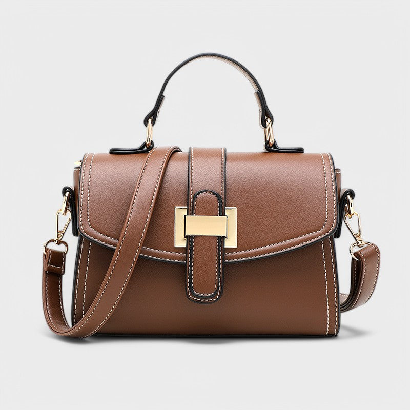 - Design: Vintage-inspiriert mit auffälliger goldener Schnalle und Kontrastnähten